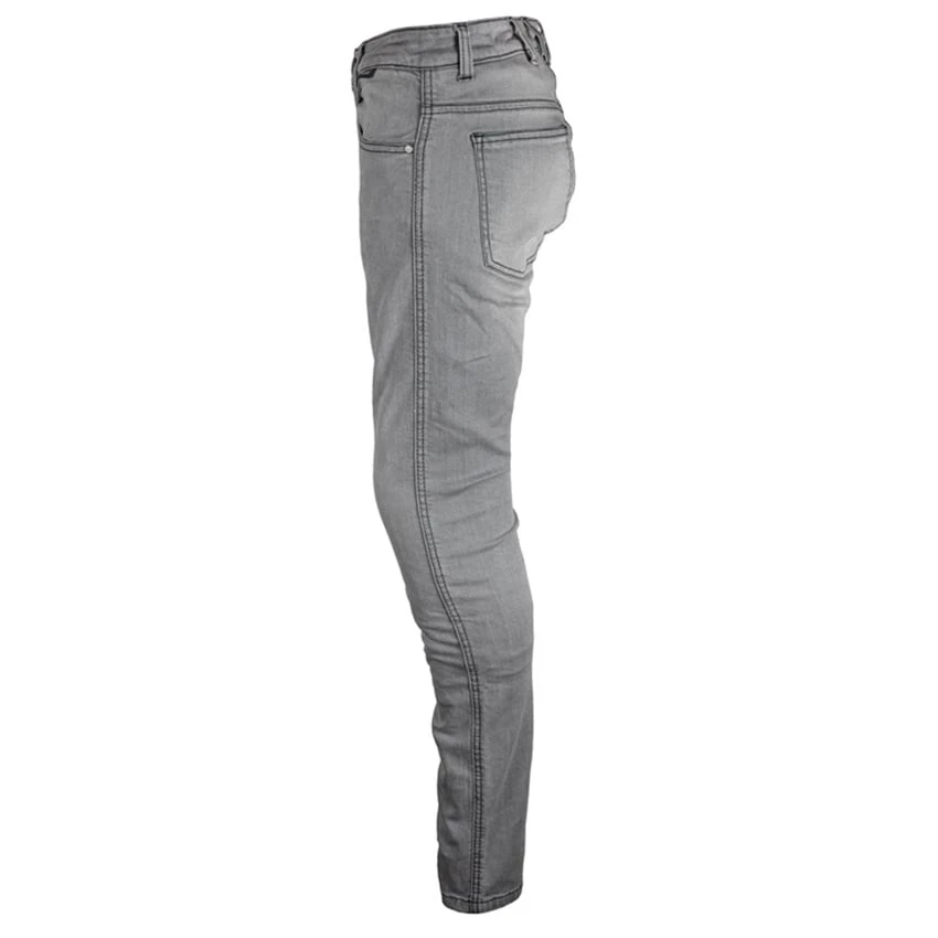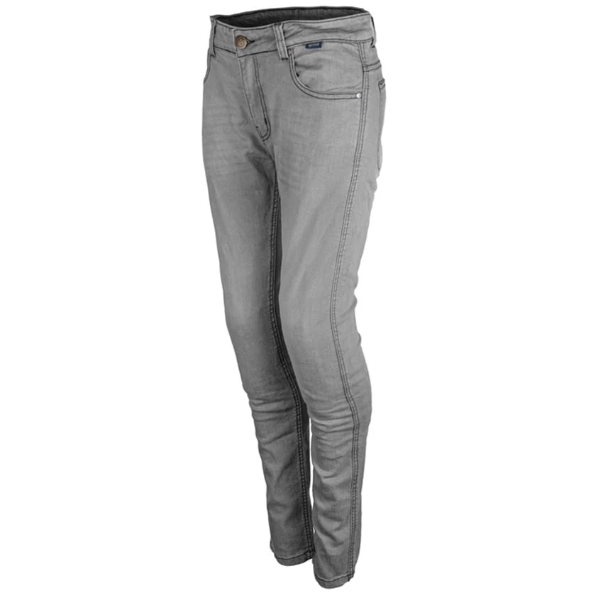 Germas Rattle women’s motorcycle jeans are made of a cotton outer shell with a Polyester lining. On the inside of these 2-layer pants you will find the protective Aramid fiber lining, applied to critical fall areas. The knees and hips are equipped with level 1 protectors. Classic 5-pocket jeans design and a slim fit fit.
