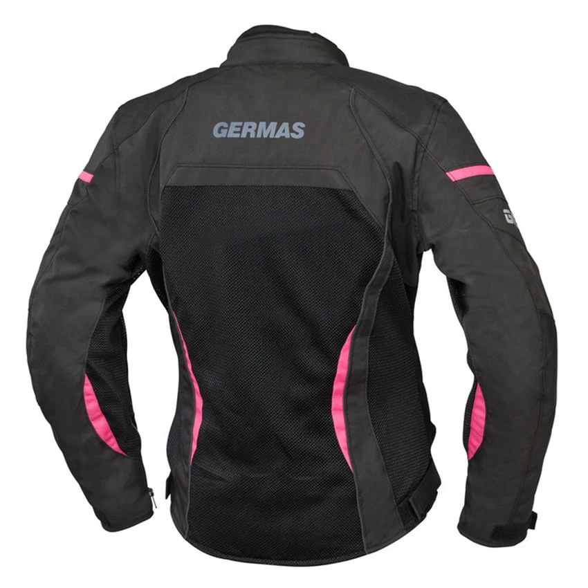 Textile women’s motorcycle jacket from Germas, the Tara Mesh is ideal for summer weather conditions. Made of hard-wearing Germadura combined with mesh for good airflow and cooling. The Tara mesh has a removable thermal vest, ideal for on cooler evenings and mornings. As standard, this women’s motorcycle jacket has CE level 1 protectors on the elbows and shoulders. The sleeve cuffs with zip and velcro are easy to use in combination with your gloves. The outer and inner pockets provide space for small personal items.