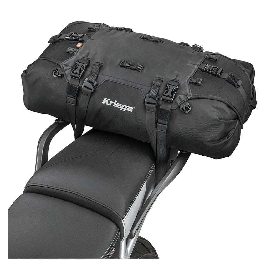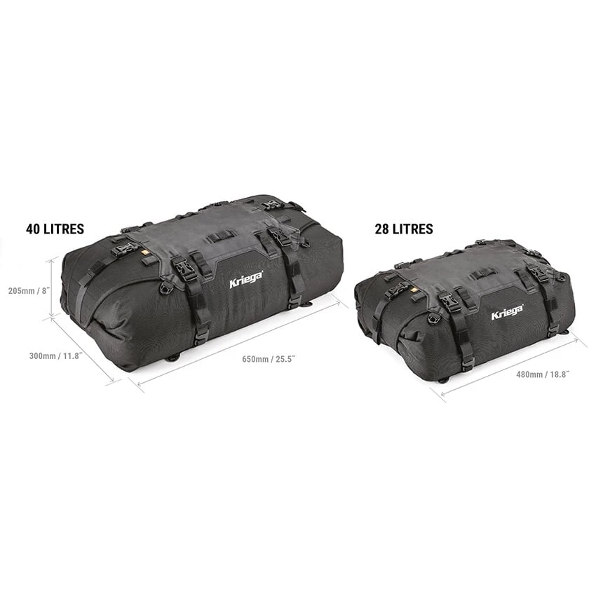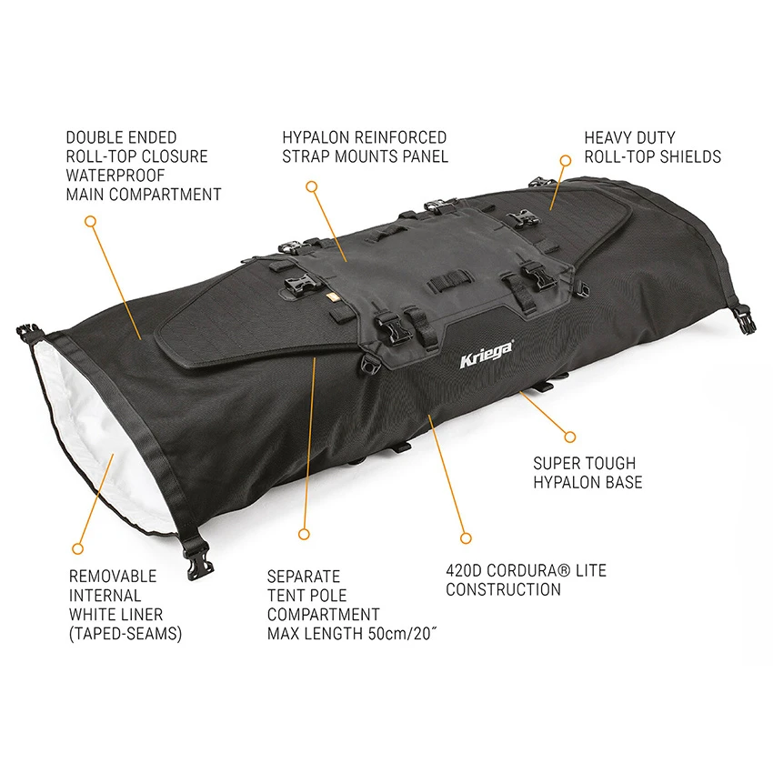 The waterproof Kriega US-40 Rackpack carrying capacity is variable from 28 to 40 litres. Set to 40 litres, the pack is perfect storage for a tent, roll mat, or sleeping bag coupled with a separate tunnel for tent poles making it an excellent moto-camping set-up. Alternatively, roll up both ends to reduce the capacity to 28 litres, ideal for waterproofs and warmer clothing on a shorter ride.