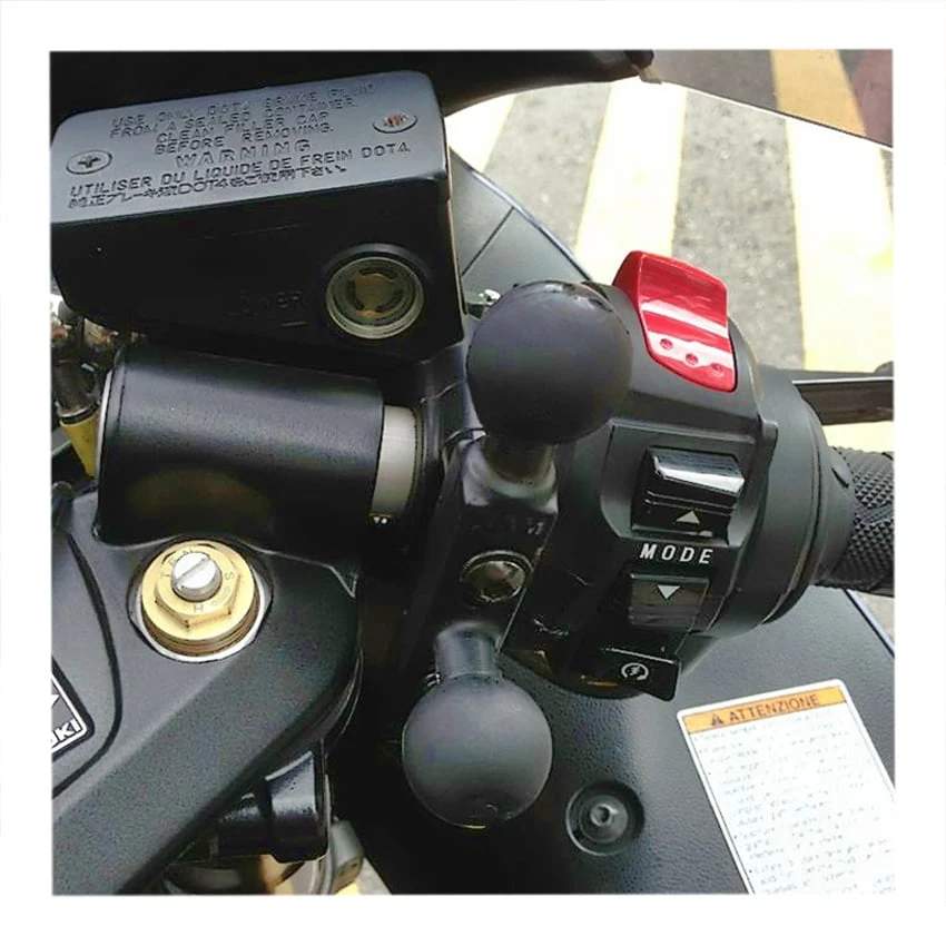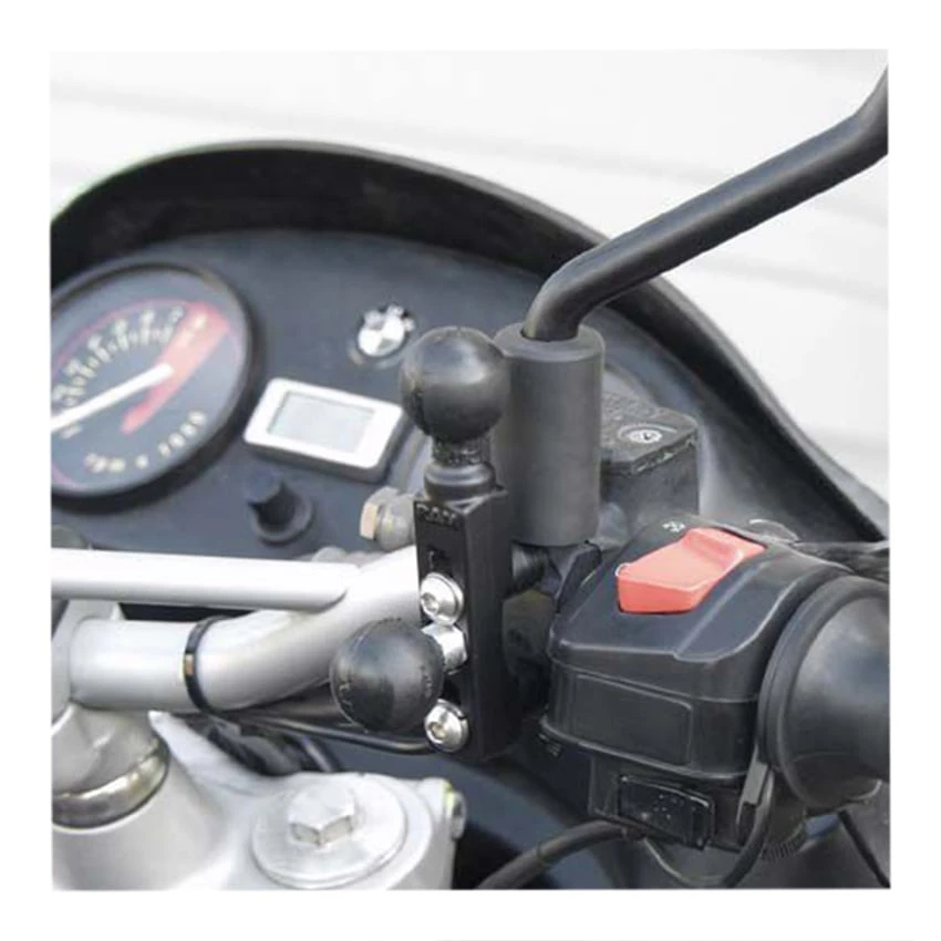 The RAM-B-309-2U connects to your handlebar clutch/brake clamp, left or right side, and holds two 1″ diameter mounting ball. The ball that is connected between the hole centers is removable. The base fits the control clamps on your motorcycle with 40mm x 6mm stainless steel hardware, provided in the kit. To see if the RAM-B-309-2 base will mount to your motorcycle, check the hole spacing of the base against your clutch/brake reservoir. The holes centers have a minimum width of 0.94″ and a maximum of 1.58″