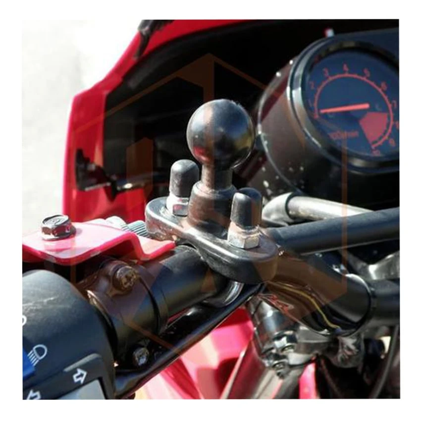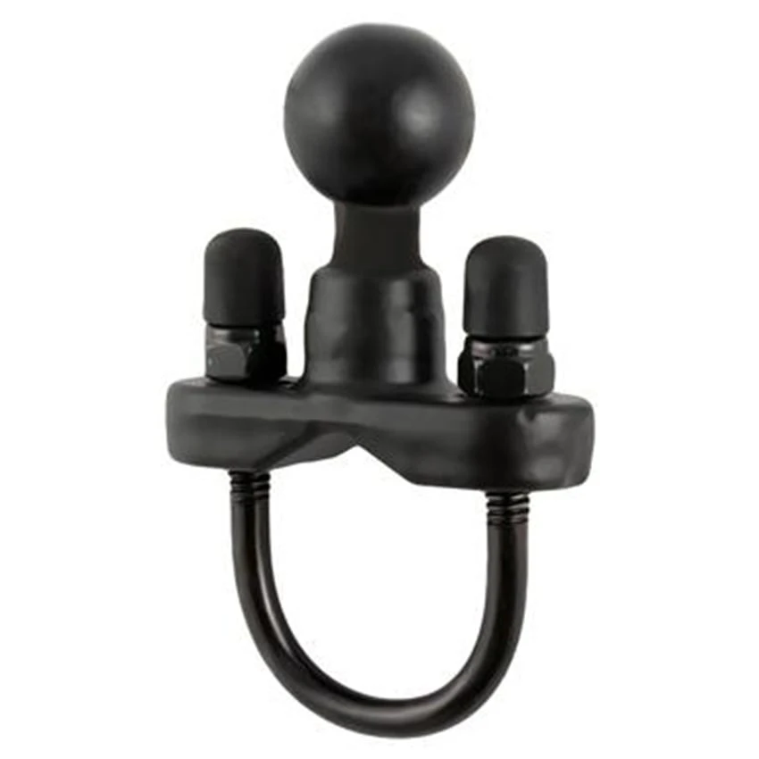 The Ram mount handlebar base with a 1.5″ rubber ball is designed to sit at right angles to the mounting rail. The stainless steel coated metal u-bolt accommodates rails in diameter from 1″ to 1.25″ (2 to 3,1 cm) in diameter. The base also includes black cover caps to be placed over the exposed ends of the U-bolt.
