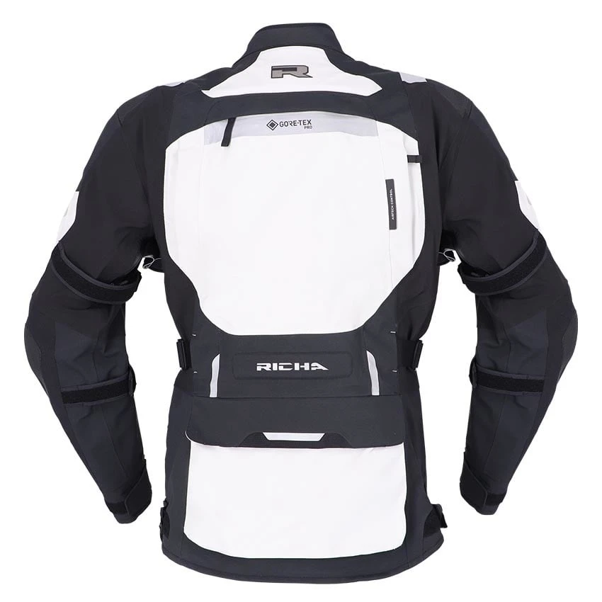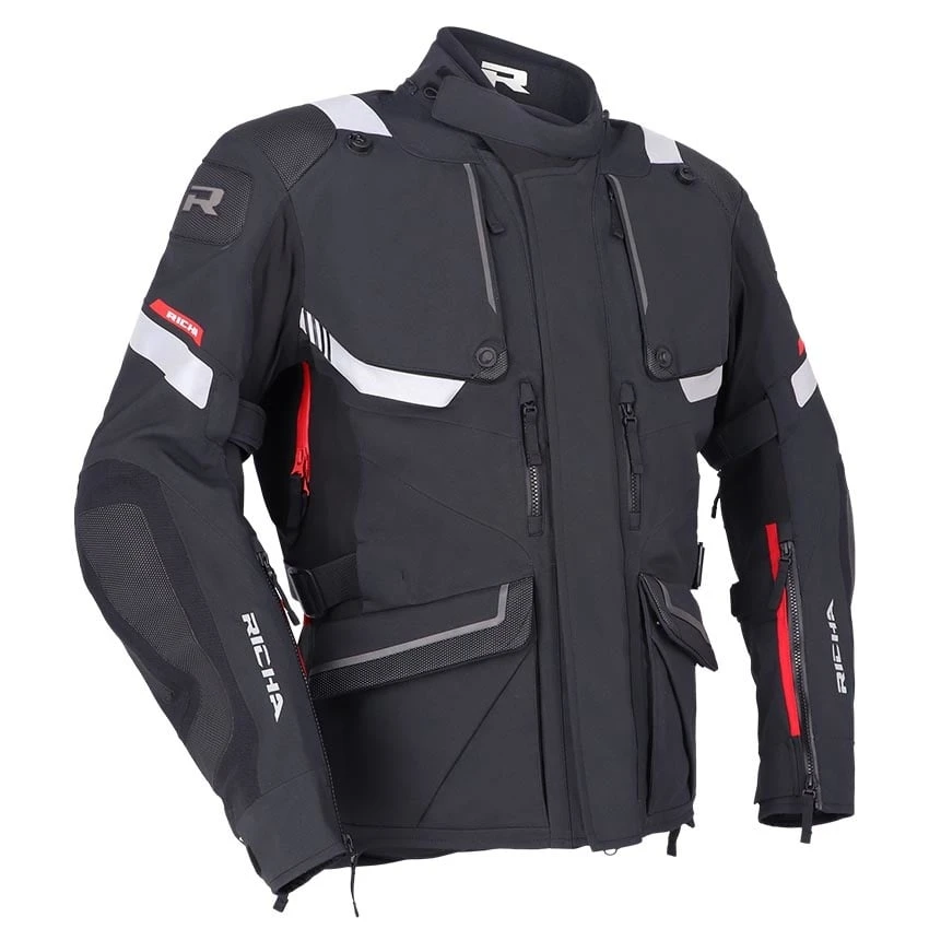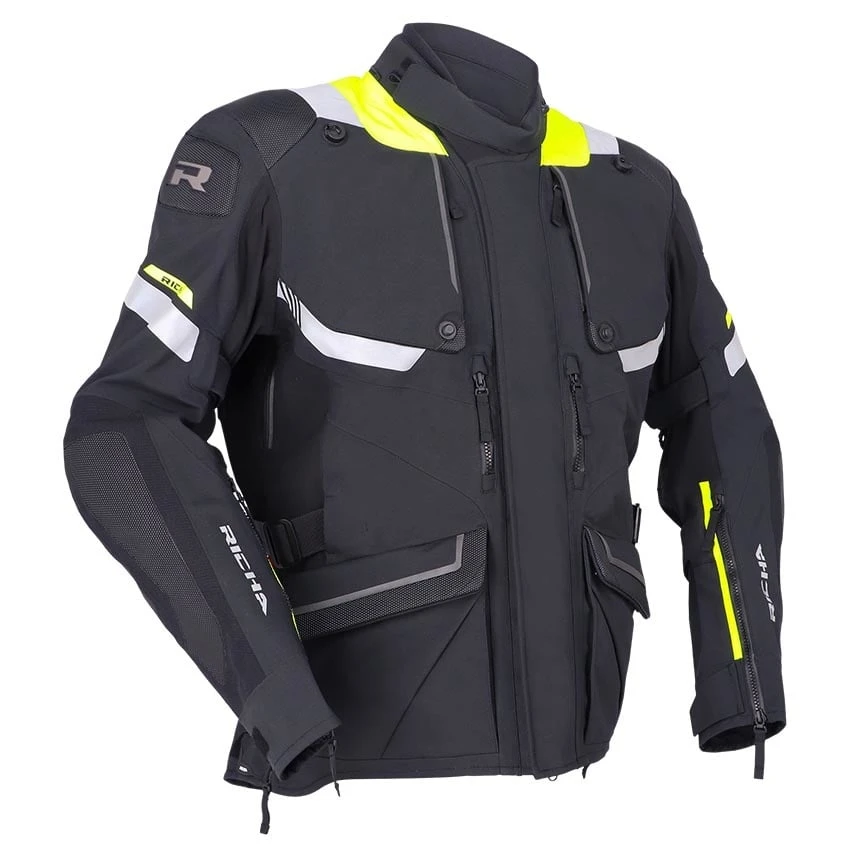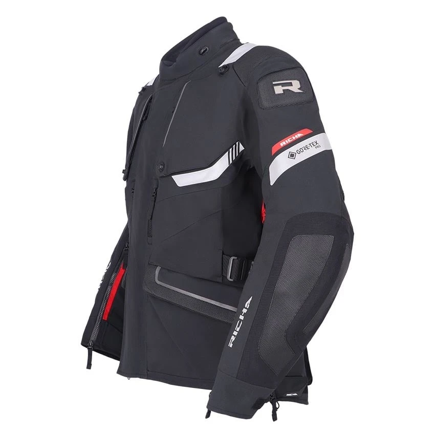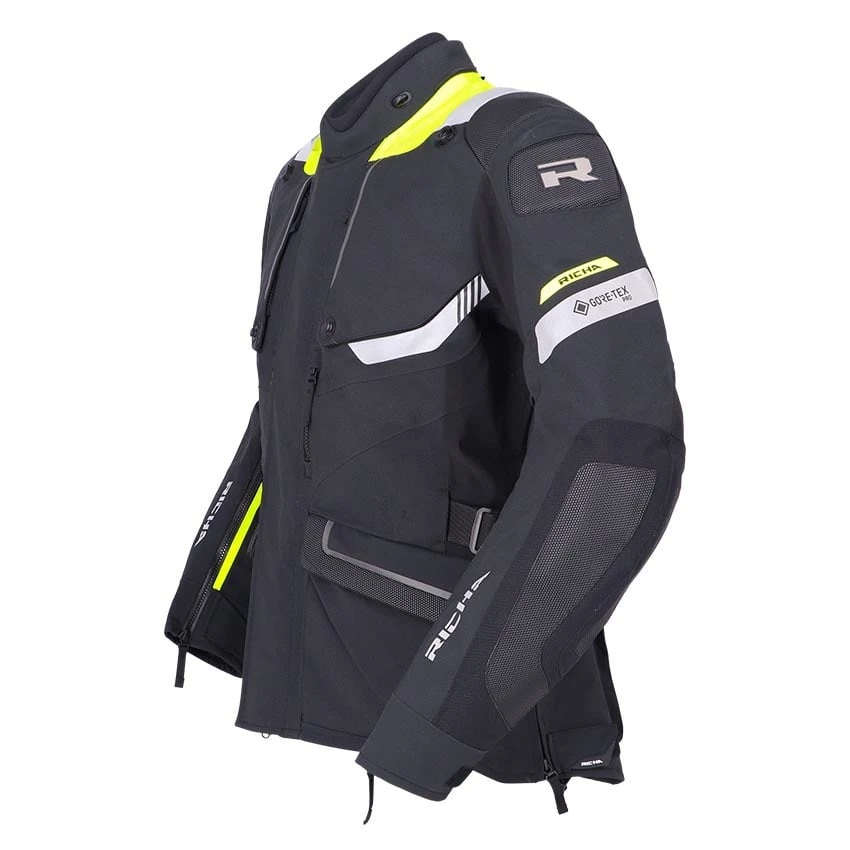 The Richa Armada GTX Pro motorcycle jacket offers everything you need, from ventilation to gore-tex waterproofing and protection, for carefree touring on your motorcycle. Made from abrasion resistant Superfabric material, 3L GORE-TEX Pro reinforced Armacor fabric and mesh panels. The Armada GTX Pro is of course completely waterproof and with a high breathability thanks to the 3L Gore-Tex laminate. In warmer climates you can use the ventilation zippers and panels for refreshing airflow cooling down the body. Supplied as standard with D3O protectors on the shoulders and elbows. For enhanced comfort, the Armada GTX Pro motorcycle jacket has a storm flap behind the zipper, stretch panels, connection zipper and adjustable straps at the waist and hip for a good fit.