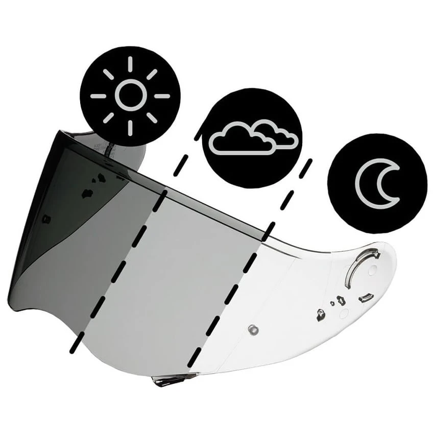 The allrounder under the visors! Depending on the brightness, this visor darkens automatically due to its light-sensitive coating. This process – from completely clear to the maximum tint – takes about 30-40 seconds.